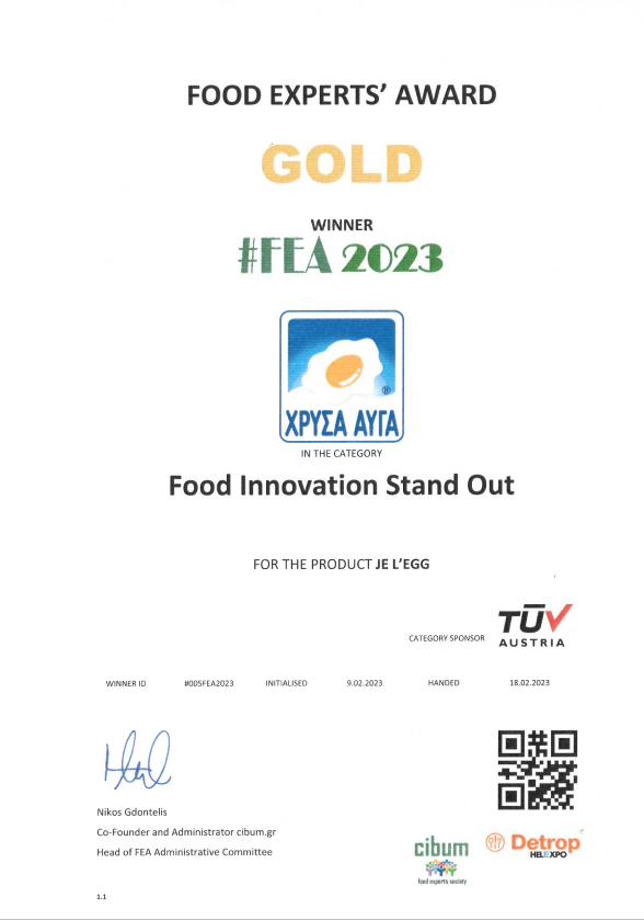 ΧΡΥΣΟ ΒΡΑΒΕΙΟ 2023 στην κατηγορία καινοτομίας, στην πρώτη διοργάνωση των Food Experts Award’s (FEA) 2023, των διεθνών βραβείων καινοτομίας και αριστείας του κλάδου τροφίμων και ποτών για το προϊόν JE L’EGG.