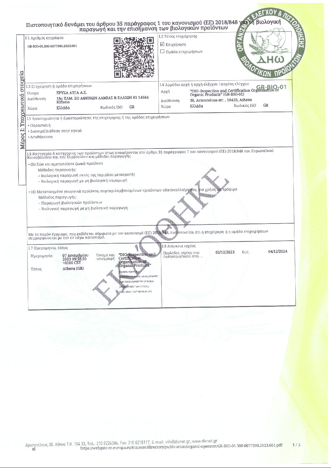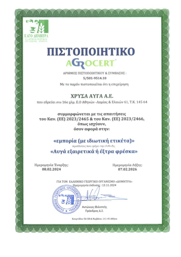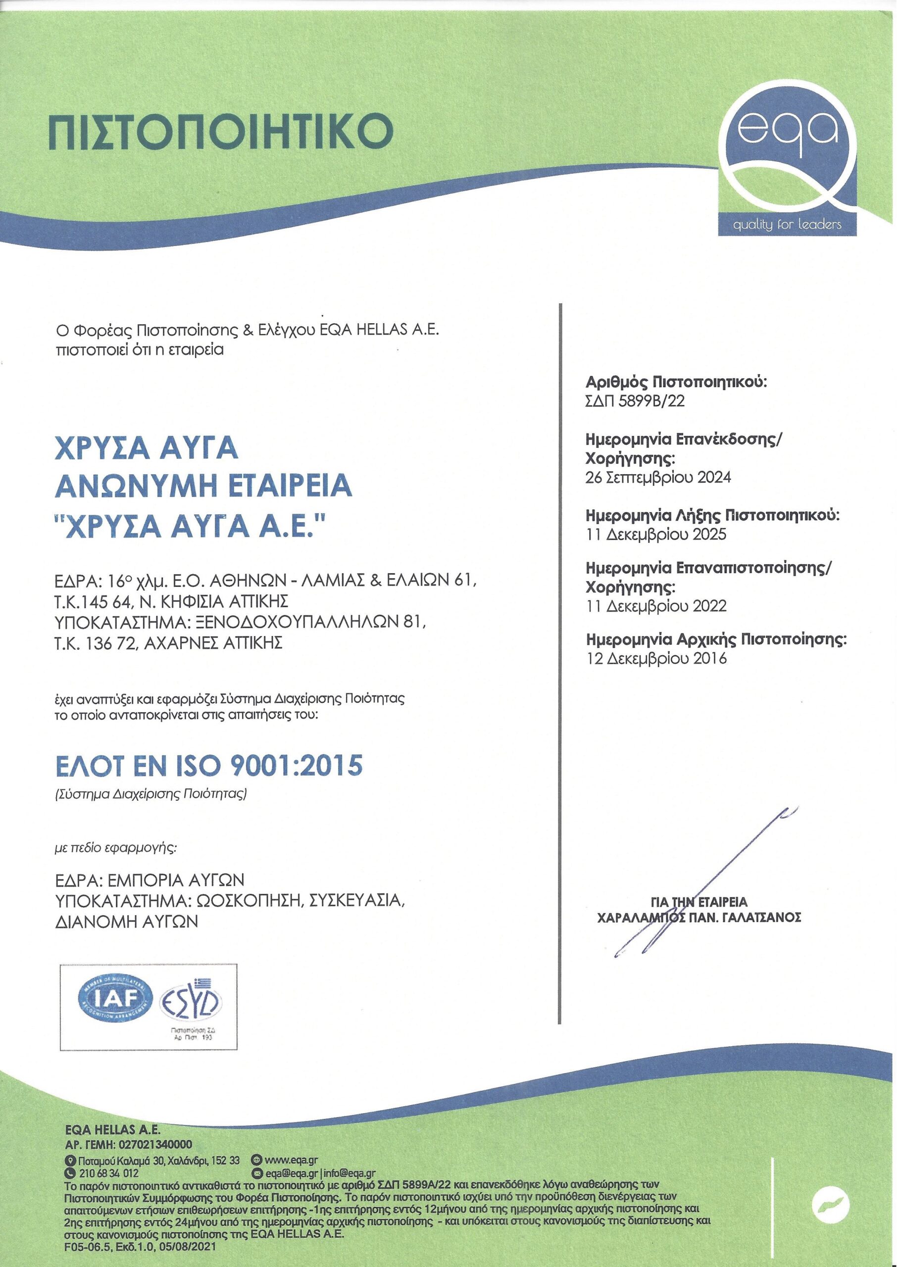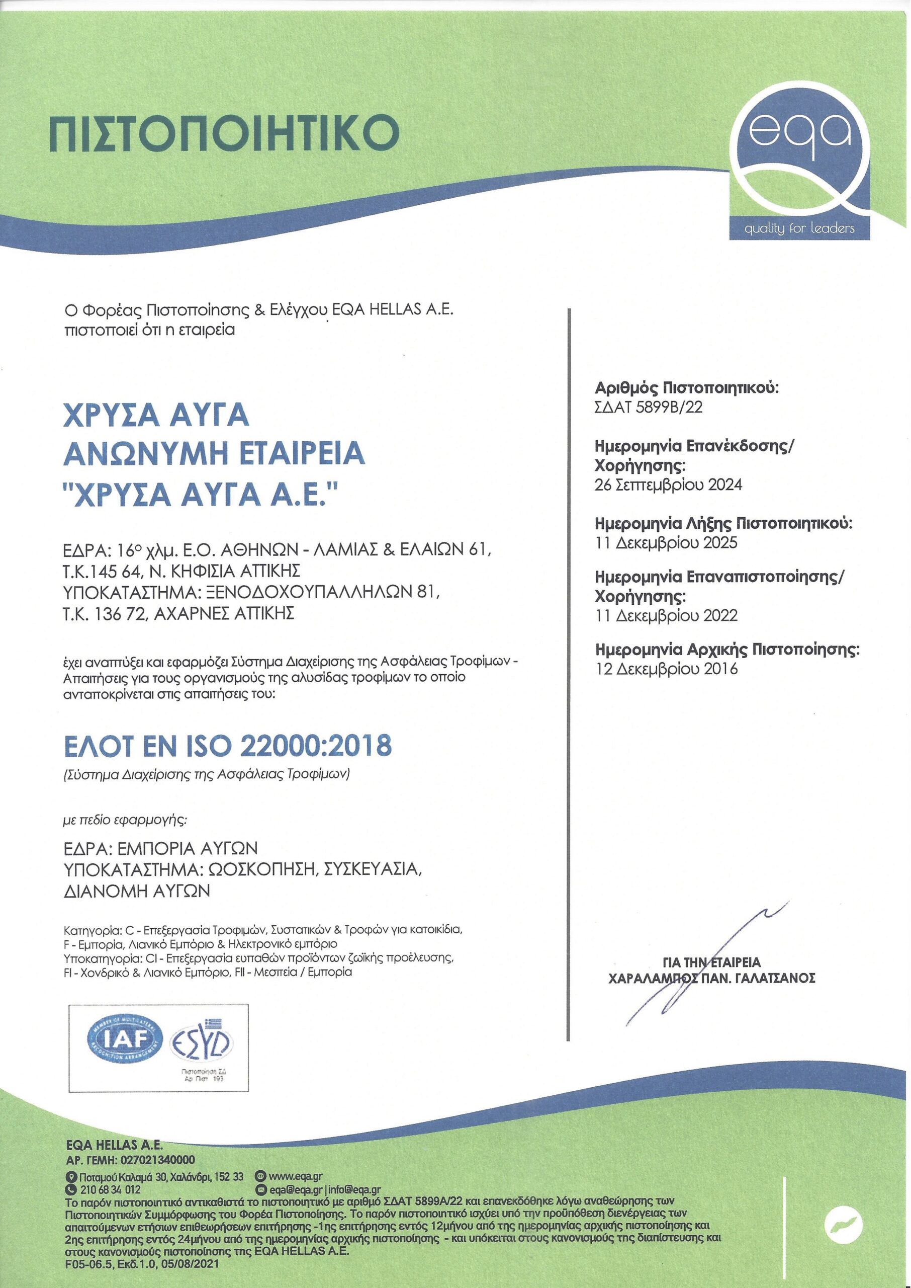 Προκειμένου η εταιρεία να διασφαλίσει την υψηλή ποιότητα που την ακολουθεί απο το ξεκίνημά της, έχει πάρει πιστοποιήσεις ISO 9001 και ISO 22000, πιστοποιητικό HACCP και IFS που εγγυώνται άψογη τυποποίηση, ωοσκόπηση και συσκευασία. Επίσης, με το GMO FREE πιστοποιεί ότι δε χορηγούνται μεταλλαγμένες ζωοτροφές και τους εμπλουτισμένους κλωβούς βάσει της διάταξης 1999/74 της Ε.Ε όπου συμμορφώθηκε και από την 1/1/2012 έχει ανανεώσει τις κλωβοστοιχίες.