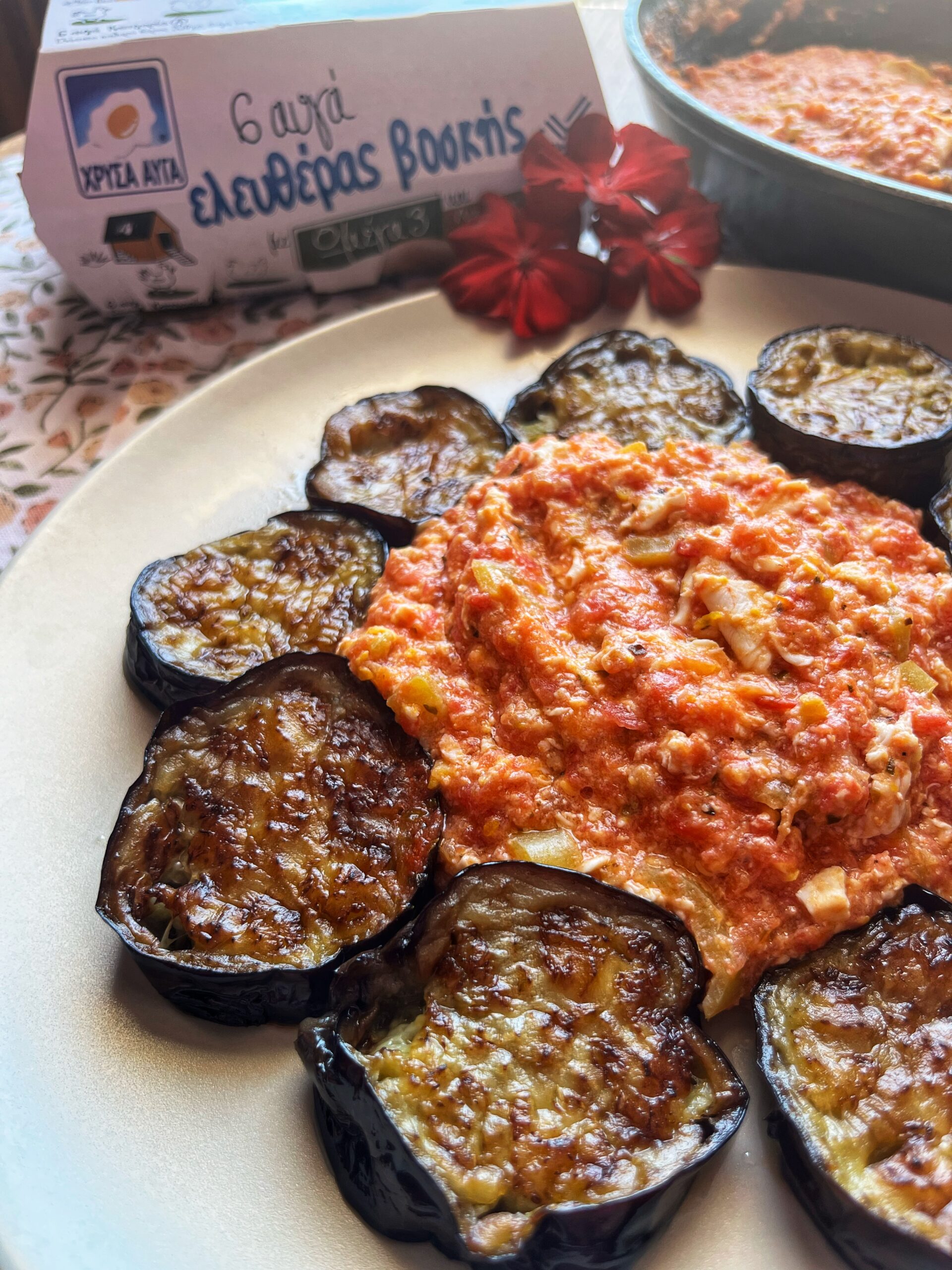 -Σε ένα μεγάλο πιάτο, τοποθετούμε κυκλικά τις μελιτζάνες και στη μέση βάζουμε τη σάλτσα μας και το ορεκτικό μας είναι έτοιμο για σερβίρισμα.