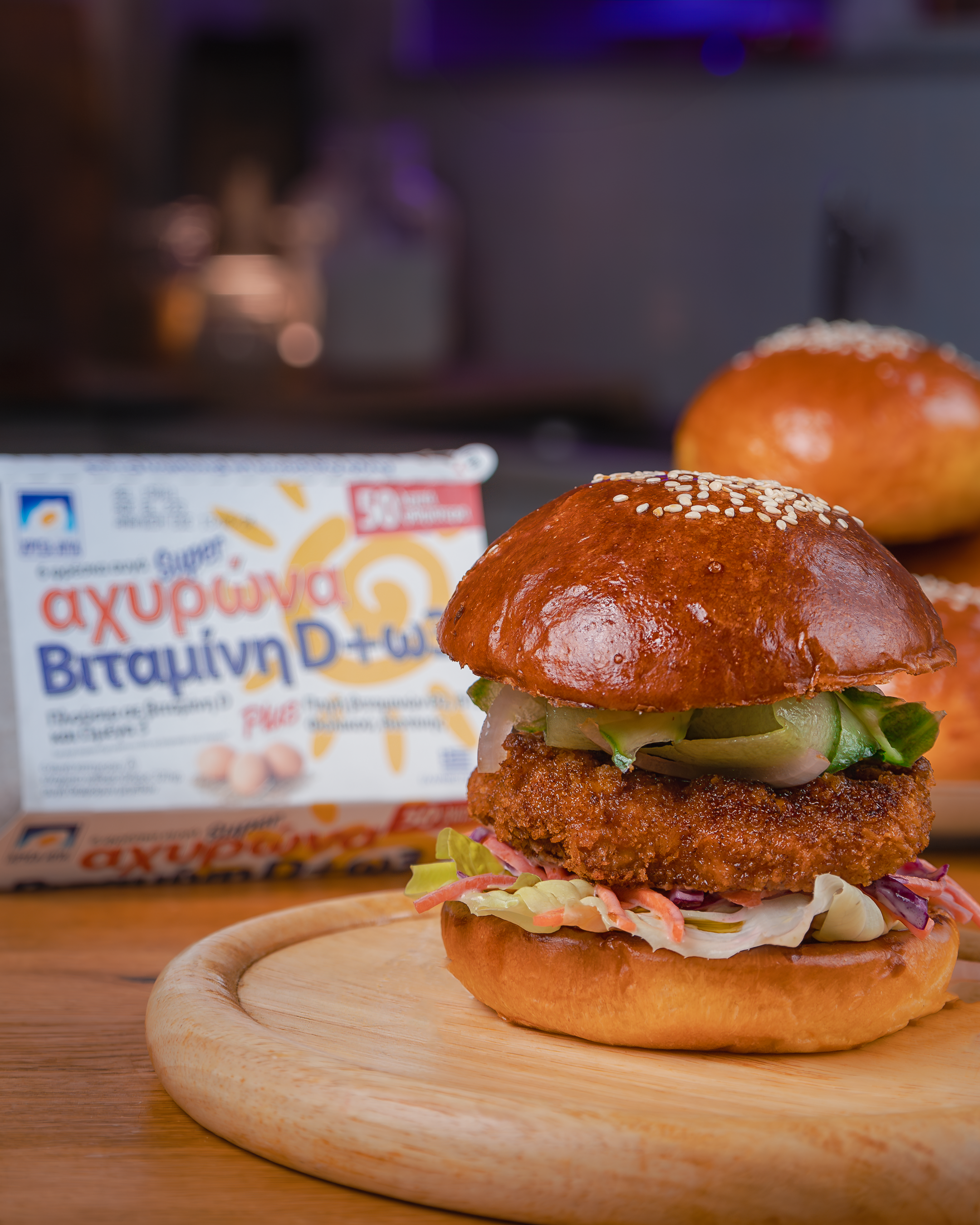 Κόβουμε το ψωμάκι και το περνάμε από ένα τηγάνι σε μέτρια φωτιά με λίγο βούτυρο μέχρι να πάρει καστανό χρώμα, απλώνουμε στην βάση ένα μαρούλι, στην συνέχεια την σαλάτα coleslaw, την κοτολέτα, ταλιατέλα αγγούρι, πίκλα κρεμμύδι και τελειώνουμε με λίγο φρέσκο ελαιόλαδο.
