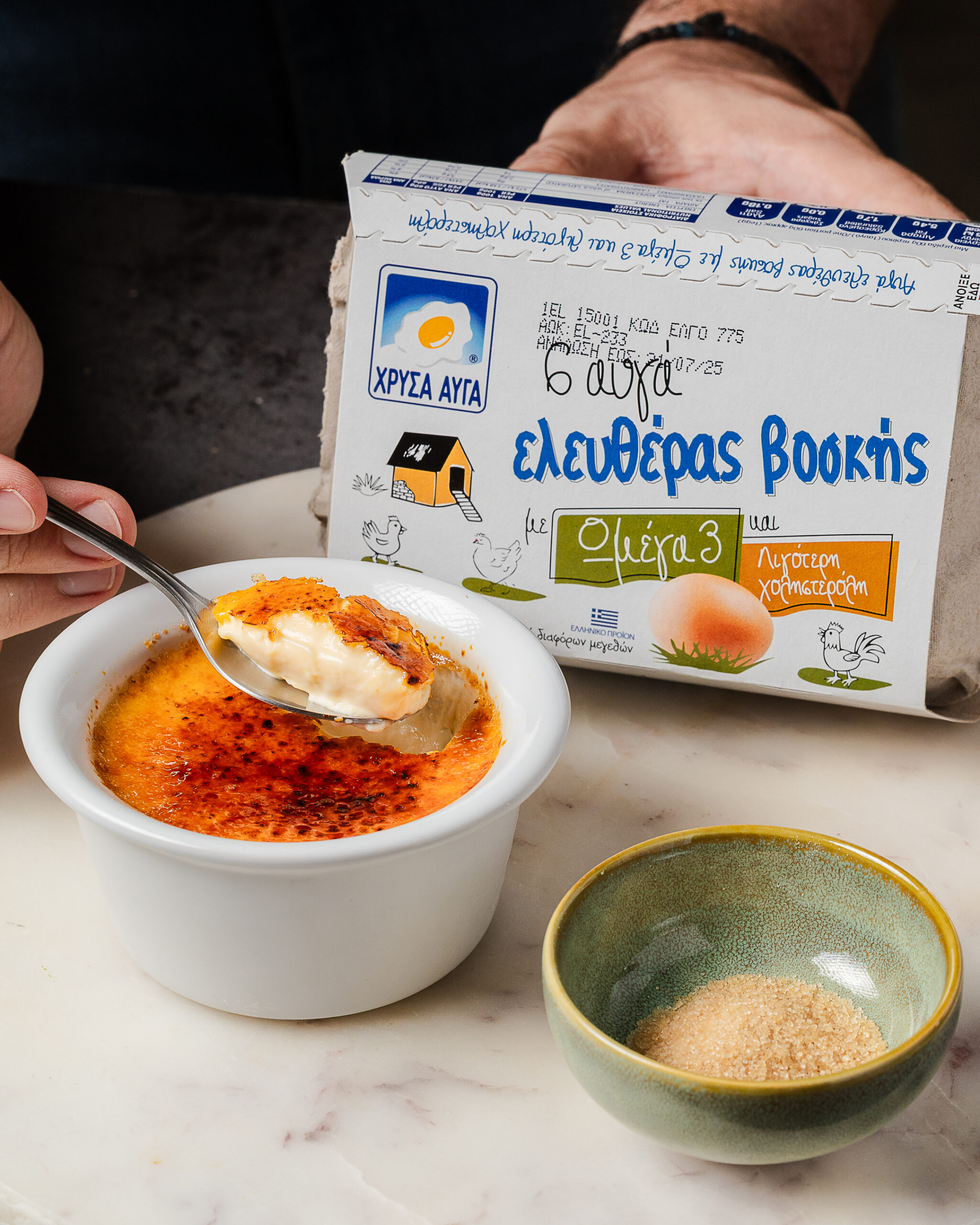 - Πριν το σερβίρισμα, πασπαλίζουμε την επιφάνεια με 1 κ.σ. ζάχαρη και την καραμελώνουμε με φλόγιστρο ή κάτω από δυνατό γκριλ.
