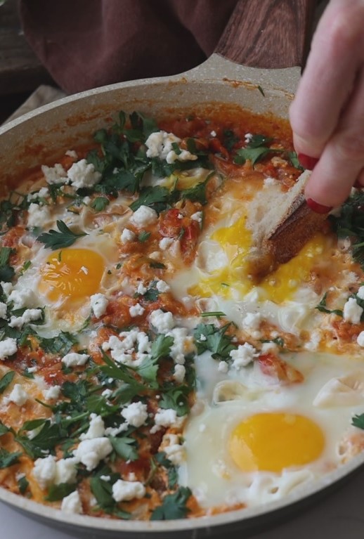 Αλατοπιπερώνεις & προσθέτεις τη ζάχαρη. Ανακατεύεις. Από πάνω σπας τρία αυγά και ψήνεις γύρω στα 10 λεπτά ακόμα. Σερβίρεις με μπόλικο μαϊντανό & τριμμένη φέτα.